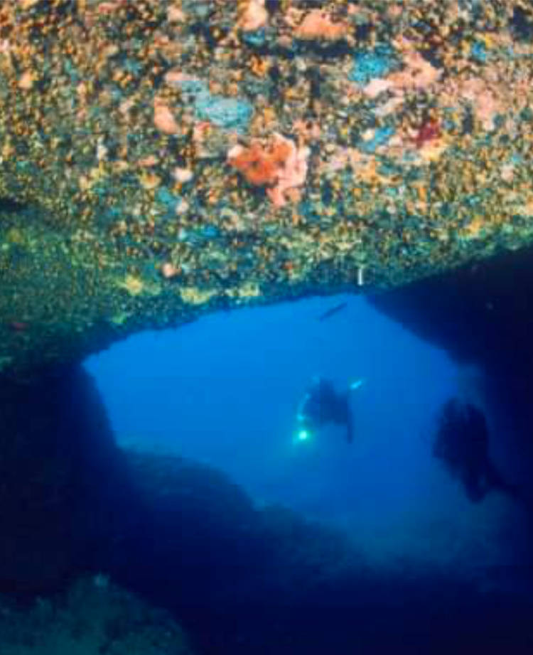 Immersione per subacquei esperti e possessori di brevetto cave (profondità max 20mt). L’ingresso posto a circa 18mt di profondità cela una grotta lunga circa 120mt con una prima stanza ricca di stalattiti e stalagmiti di notevole grandezza. Un percorso stretto e angusto (sifone) consente l’accesso alla seconda stanza detta della cattedrale, con la volta ricoperta da stalattiti di varia forma e misure, alcune arrivano a superare i 4mt. Dalla seconda stanza è possibile accedere ad una bolla d’aria molto caratteristica. Habitat naturale per Corvine, Gamberetti Parapandoli e Magnose (Cicala grande di mare). Il sedimento sul fondo della grotta rende questa immersione abbastanza complicata dal punto di vista tecnico.